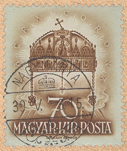 1A posta a hercegprímás javaslatára Szent István halálának 900. évfordulójára rendezett Szent István év alkalmából 14 címletből álló bélyegsorozatot bocsájtott ki, melyet Légrády Sándor tervezett. A sorozat első 13 címletén Szent István életének és uralkodásának nevezetesebb eseményei elevenednek meg. Az olajzöld színű 70 filléres címleten azonban a királyi korona látható jelenlegi formájában, amit dicsfény övez szélén kör alakban a SACRA CORONA felirat látható. A bélyegből több mint 3,3 millió darab került forgalomba, így hiába nagyon szép, de nem számít ritkaságnak. |