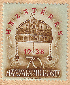 21938. november 2. napján az első bécsi döntés Csehszlovákiától 12.000 km2 Trianonban elcsatolt területet juttatott vissza Magyarországhoz 869 ezer fő lakossággal. Ennek alkalmából a posta alkalmi bélyegpárt adott ki. A kibocsátáshoz a Légrády Sándor által tervezett Szent István sorozat 20 és 70 filléres értékeit használták fel. A bélyegrajz azonos volt a korábbi sorozattal, azonban a 20 filléres esetében azonban a 20 filléresen a korábbi vörös színt barnásvörösre cserélték, a 70 filléres olajzöld nyomatát pedig a barna szín váltotta fel. Mindkét bélyegre felkerült a HAZATÉRÉS 1938 felirat. A 20 filléresből 4,4 millió darab, a 70 filléres címletből pedig 1,4 millió darab került forgalomba, így ezek a bélyegek sem számítanak ritkaságnak. |