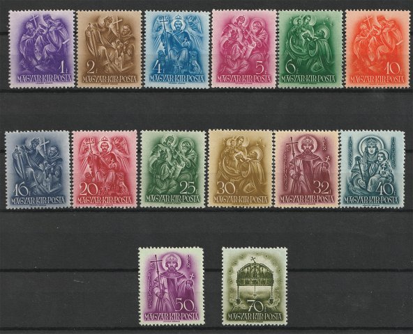 1A posta a hercegprímás javaslatára Szent István halálának 900. évfordulójára rendezett Szent István év alkalmából 14 címletből álló bélyegsorozatot bocsájtott ki, melyet Légrády Sándor tervezett. A sorozat első 13 címletén Szent István életének és uralkodásának nevezetesebb eseményei elevenednek meg. Az olajzöld színű 70 filléres címleten azonban a királyi korona látható jelenlegi formájában, amit dicsfény övez szélén kör alakban a SACRA CORONA felirat látható. A bélyegből több mint 3,3 millió darab került forgalomba, így hiába nagyon szép, de nem számít ritkaságnak. |